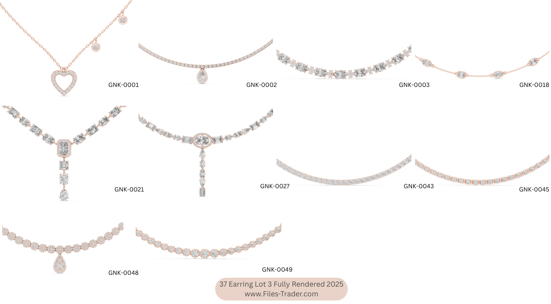 It’s a Pack of 10 Necklace Lot 3 Fully Rendered 2025. 3dm and Stl files are available. Fully Rendered detail images and video are available. Free samples are uploaded on your website.