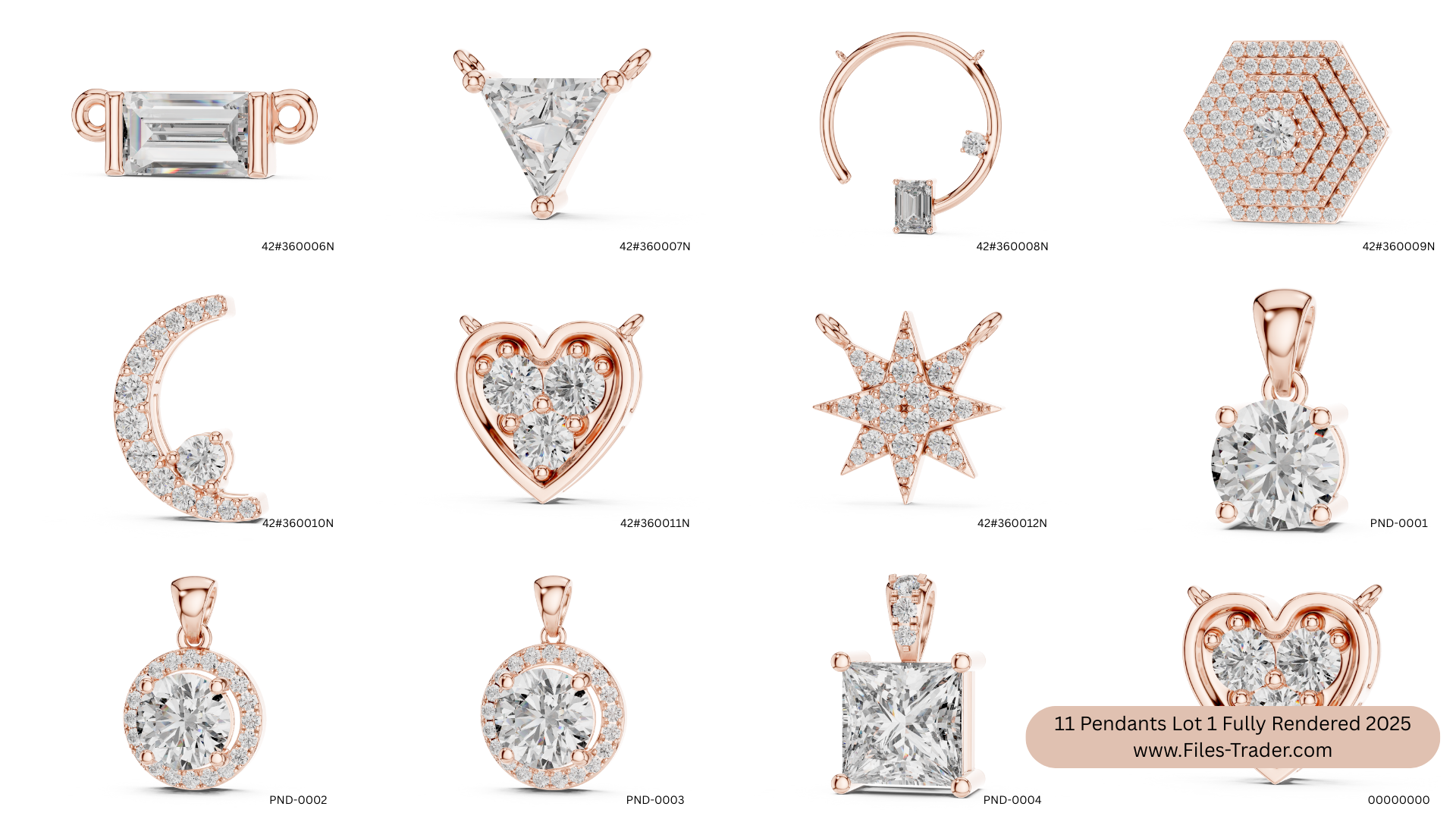 It’s a Pack of 11 Pendants Lot 1 Fully Rendered 2025. 3dm and Stl files are available. Fully Rendered detail images and video are available. Free samples are uploaded on your website.